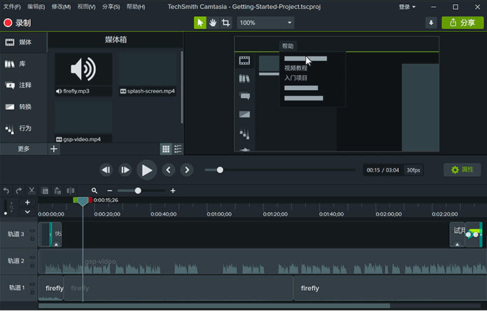 Camtasia是由美國TechSmith公司出品的一款螢幕錄製及影片編輯軟體,其包含了螢幕錄影、視訊短片和編輯、影片錄音配音、影片功能表製作、影片劇場和影片播放等功能。